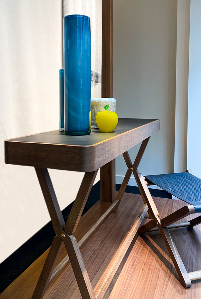 Duvivier Canapés Dimensions : l 150 x h 80 x p 40 cm La console Émile, conçue par le designer Guillaume Hinfray, incarne l'élégance et l'expertise du savoir-faire artisanal français. Chaque détail, des finitions en bois massif finement travaillées au cuir pleine fleur soigneusement sélectionné, témoigne d'un savoir-faire artisanal inégalé. Les artisans de Duvivier Canapés, maîtres dans l'art du cuir et du bois, ont su sublimer cette pièce en associant tradition et modernité, pour en faire un meuble à la fois élégant et fonctionnel. Grâce à son design épuré et intemporel signé Guillaume Hinfray, la console Émile s'intègre harmonieusement dans tout type d'intérieur, qu'il soit contemporain ou classique. Symbole de durabilité et de luxe artisanal français, elle se distingue par sa capacité à rehausser votre décoration, que ce soit placée devant un mur ou derrière un canapé, avec sa hauteur parfaitement étudiée. En choisissant la console Émile, vous faites le choix d'un meuble d'exception, à la fois raffiné et durable, conçu avec passion par des artisans experts. Un véritable investissement dans un mobilier de haut de gamme, qui allie fonctionnalité et élégance intemporelle. Beauté du bois Chêne massif provenant de forêt éco-gérée Élégance d'un cuir pleine fleur d'exception Geste précis pour une incrustation de cuir parfaite